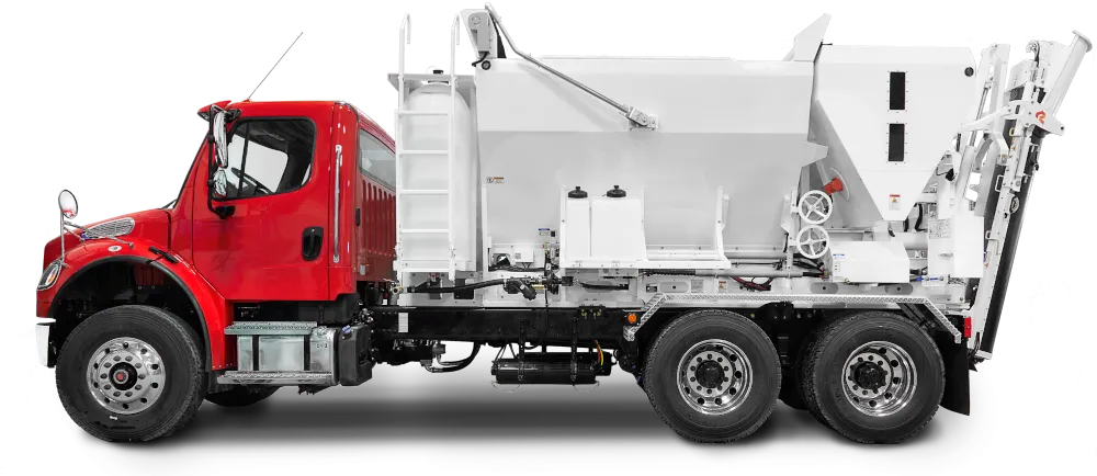Instead of ordering fixed quantities from a distant batch plant, MBUA’s units carry bins for cement and sand, a metered water system, and a high-speed mixing auger. At the push of a button, these units blend precise volumes of raw materials into fresh concrete.