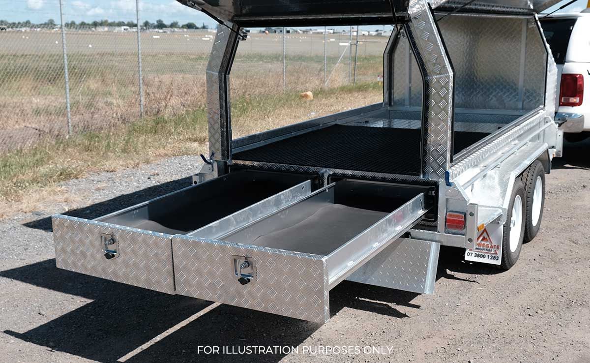 • Drawbar Mounted Fridge / Tradie Toolbox with Shelf Storage and Top Basket